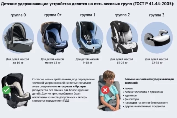 Детей до 7 лет можно перевозить в автомобиле только с использованием детского удерживающего устройства (автолюльки или автокресла), соответствующего их росту и весу. Это правило едино для переднего и заднего сидений. Детей в возрасте от 7 до 11 лет включительно на заднем сиденье можно перевозить либо в автокресле, либо пристегнутыми штатным ремнем безопасности. Однако на переднем сиденье для ребенка этой возрастной группы автокресло остается обязательным. Перевозка детей старше 12 лет разрешена с использованием штатных ремней безопасности.
